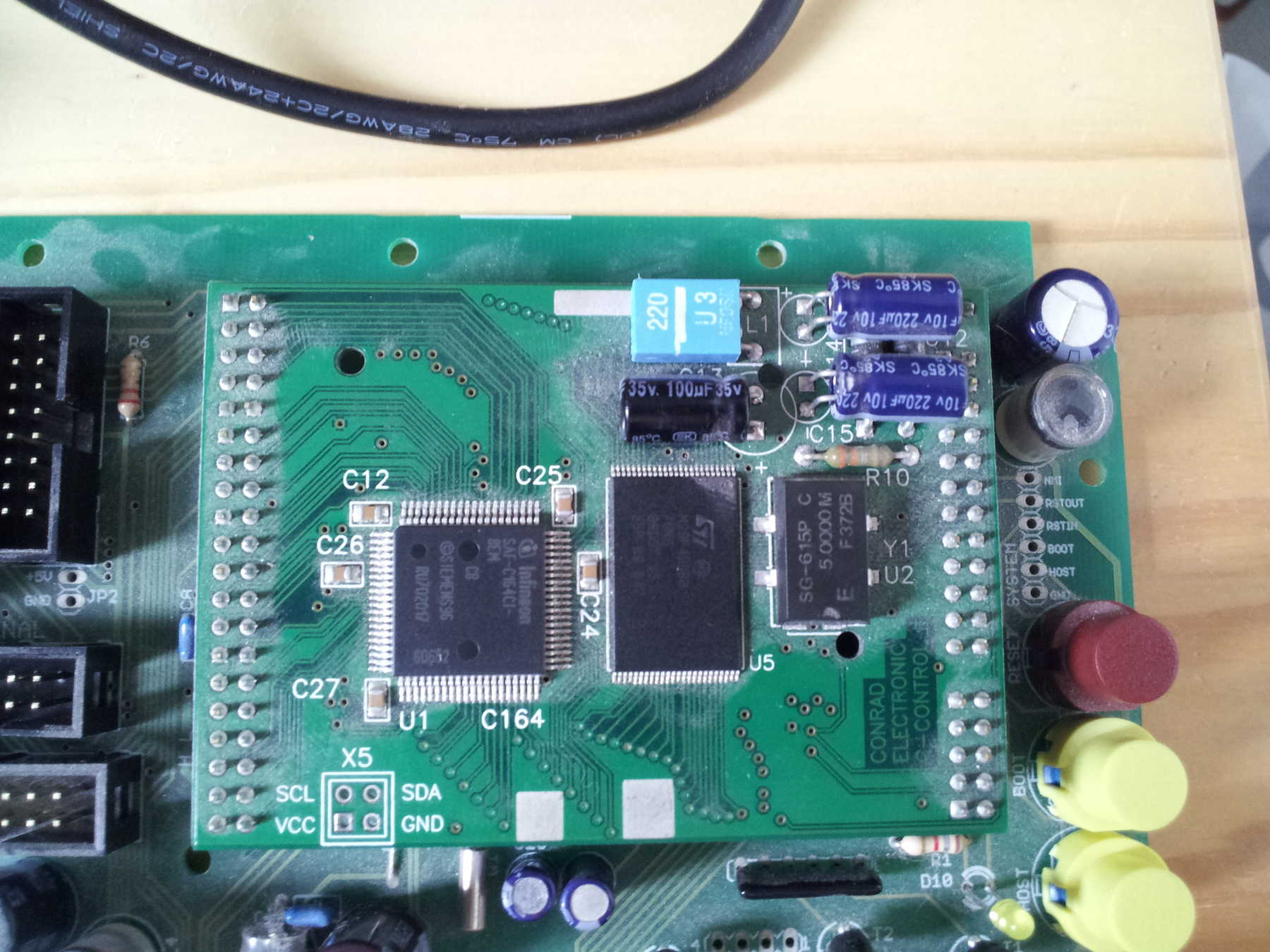 Hallo, nach längerer Zeit wollte ich mich endlich wieder meiner CC2 mit Reglerboard widmen und habe aus Mangel an Serieller Schnittstelle den XPort in Betrieb genommen. Als ich diesen im laufenden Betrieb an das Reglerboard anstöpseln wollte, funkte und knisterte es plötzlich und es ging danach nichts mehr. Ich habe dann mal einige Messungen mit folgendem Ergebnis durchgeführt: Spannungen ========== Board: 12,03 V Unit 12 V Eingang: 11,39 V Unit 5 V Ausgang: 1,78 V Stromaufnahme 12 V ================== Board: 380 mA Unit: 380 mA Stromaufnahme 5 V ================= Unit: Netzgerät geht in die 500-mA-Grenze Ich muss aber erläuternd dazu sagen, dass das Netzgerät auch bei 12 V in die Strombegrenzung lief, als ich diesen auf 500 mA begrenzt habe. Ohne Begrenzung konnte ich obige Werte messen, die ja unterhalb von 500 mA liegen... Ich bin leider nicht der Profi, um das richtig zu deuten. Jedenfalls habe ich mich nicht getraut den Strom am 5-V-Ausgang der Unit zu erhöhen. Mir ist noch aufgefallen, dass der C164 recht schnell sehr warm wird und dieses blaue Teil (Drossel?) auch. Der Flash scheint sich normal zu verhalten, wird irgendwann handwarm. Kann ich aus den Beobachtungen schlie�en, dass der C164 hinüber ist oder sind auch andere Defekte denkbar/wahrscheinlich? VG, Martin IMG_20130809_084738.jpg: ![]() | ||